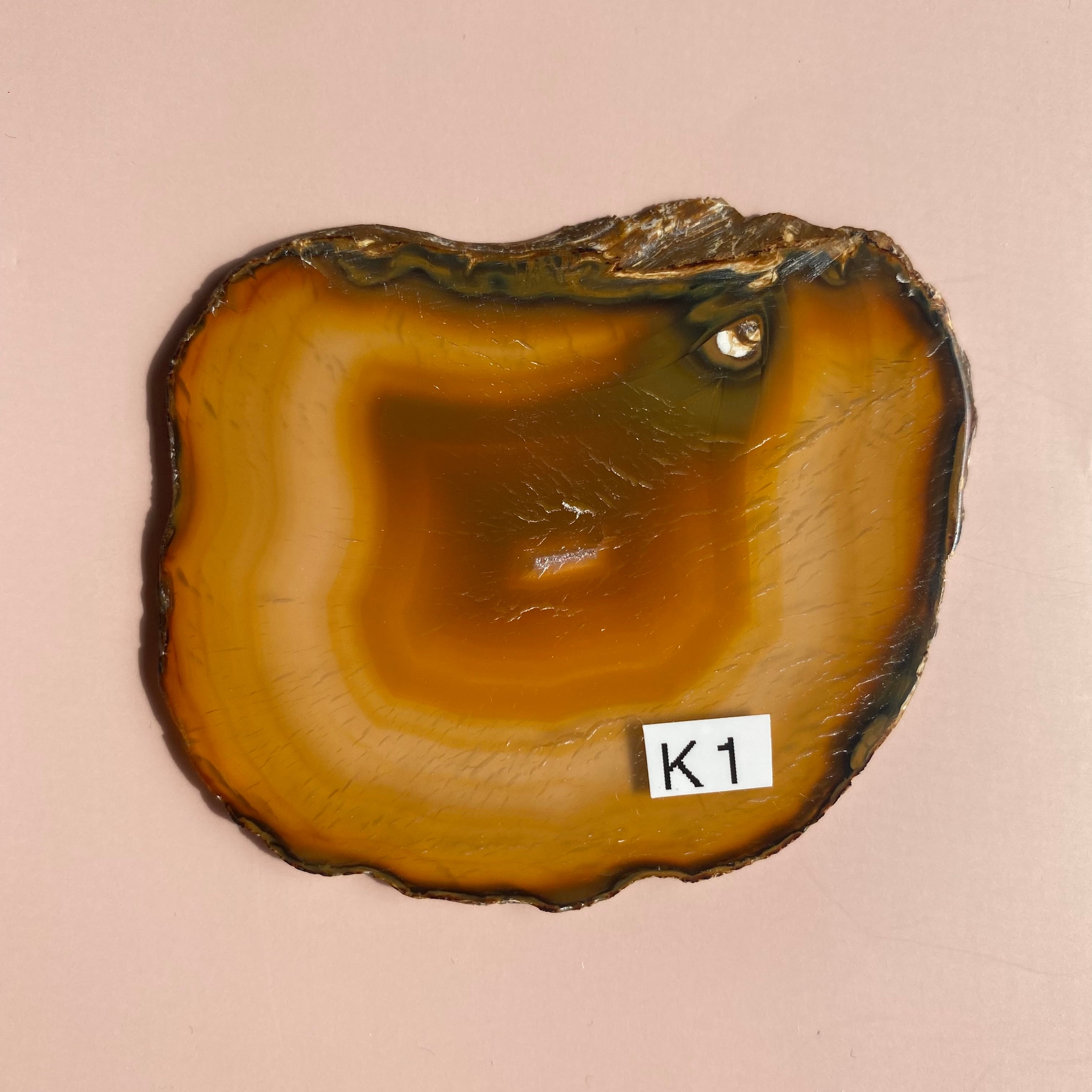 一つの石からスライスして切り出しているので、同じような形のものをいくつか出品しています。一つの石から切り出させるアゲートは通常15枚前後ですが、これは、なんと50スライスも切り出させた石。それだけでも、特別なパワーを感じますね!